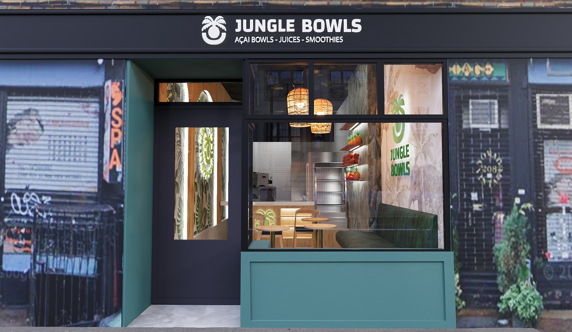 We were commissioned to design the interior for Jungle Bowls, a fresh and vibrant new concept specializing in açaí bowls, juices, and smoothies. The client’s vision was clear: create an immersive space that feels like stepping into a modern urban jungle—bold, energizing, and rooted in nature.